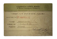 Essentially, it is Edward Carnby's Private Investigator license. It is an official document provided by the Louisiana State Board of Private Investigator Examiners, containing his license number and address. The license can be found in his inventory since the very beginning along with Lasting Debt.